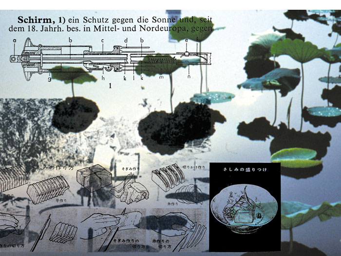 31,5 x 42,5 x 9,5 cm, 3 bedruckte Glasplatten, Holzrahmen, Leuchtstoffröhren