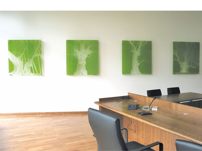 Wandinstallation Gerichtslinden / Wall installation, Lime trees as former places for jurisdiction 4 Siebdrucke auf Glas, als Umkehrung einfarbig gerastert mit 10 cm Abstand zur Wand befestigt, Screenprints on glass, 86 x 95 x 0,8 cm